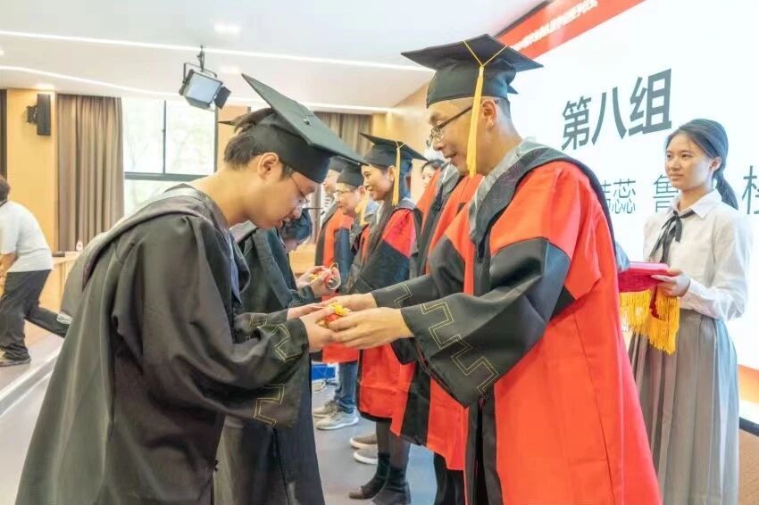 毕业典礼举行了隆重的学位授予仪式,5位导师为毕业生们颁发了校友荣誉证书,并一一扶正流苏、合影留念。