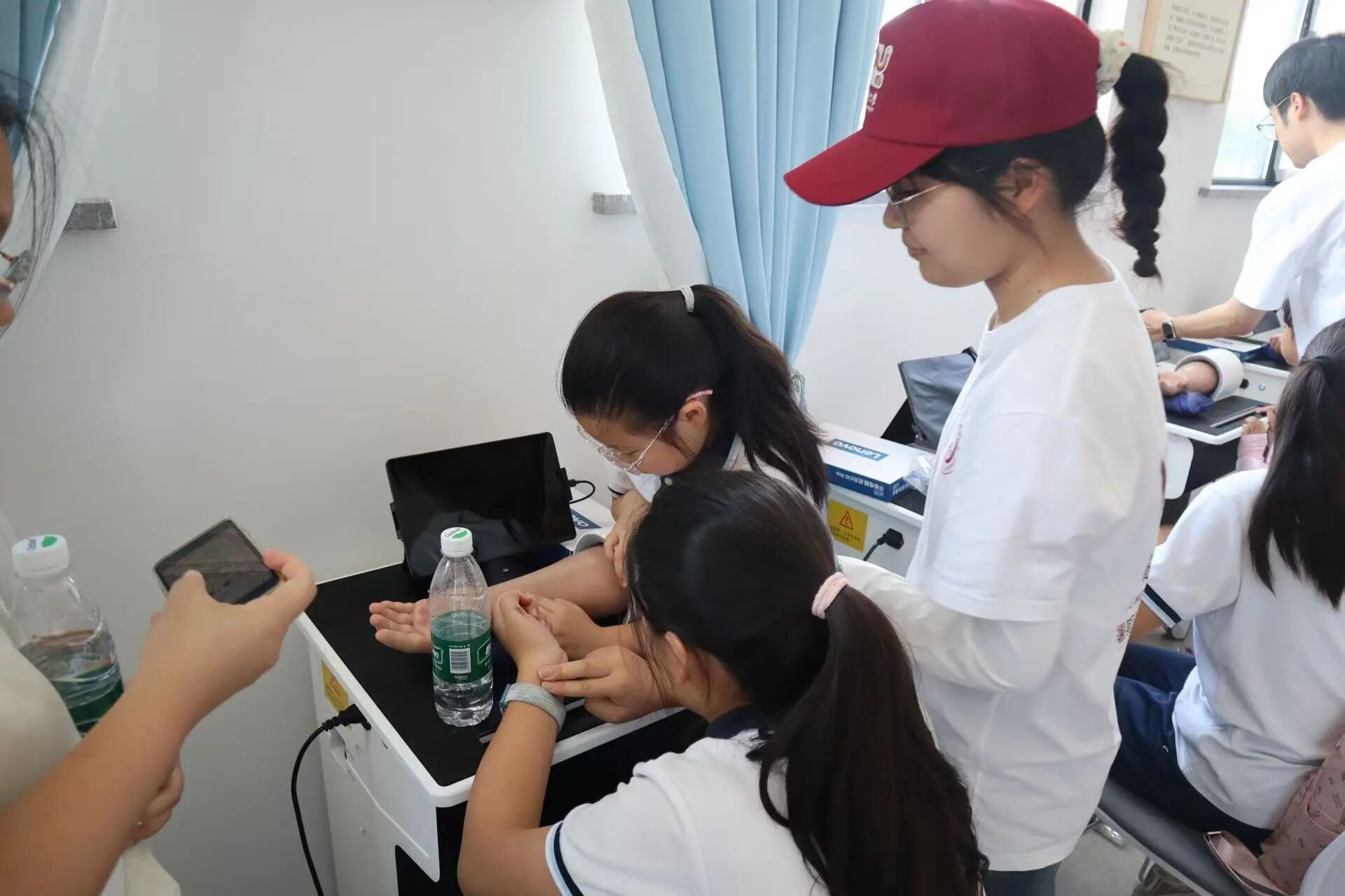中医实训室内,小学生们在实践团志愿者的引导下,化身为小小中医师。他们屏息凝神,指尖轻触特制脉枕,直观感受 “浮脉”“沉脉” 等变化,体会气血在方寸间的奔流;面对舌诊模型,孩子们伸出小舌头认真对照,学习观察舌苔厚薄与色泽,理解“舌为心之苗”的古老诊法,获取个性化健康建议。这一刻,抽象的中医诊断学化作可触可感的奇妙体验。
