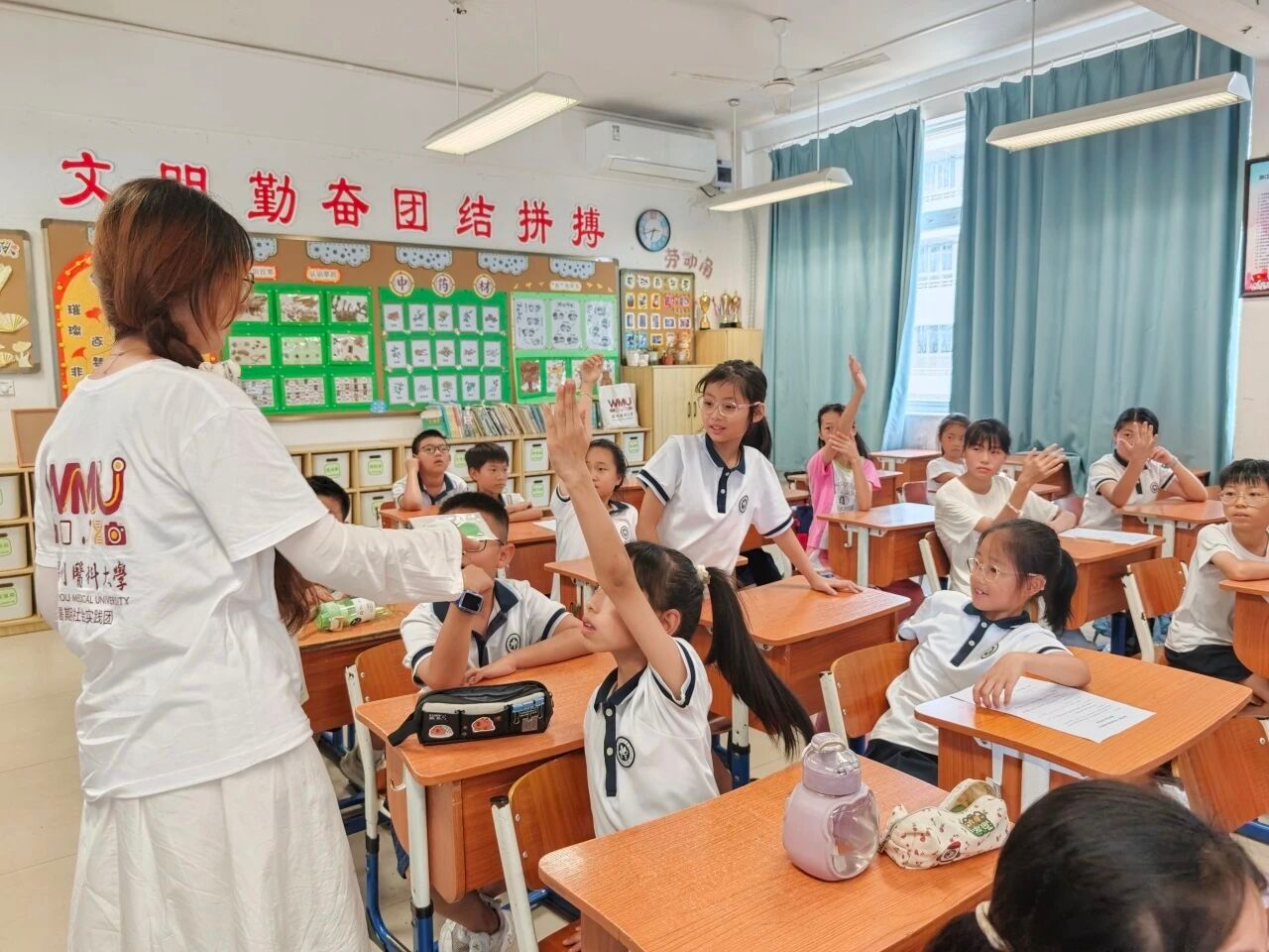 针对暑期高温特点,实践团成员孙莎莎带来了实用的《中医夏季防暑小知识》课程。她深入浅出地从中医学角度解析中暑成因,并围绕“预防”、“识别”、“急救”三大核心,为孩子们送上“中医凉方”。从日常防晒要点、推荐清热解暑的食疗方(如绿豆汤),到简易的急救穴位按压(如人中穴)演示,孙莎莎用通俗易懂的语言,将古老的中医智慧转化为孩子们可理解、可操作的实用技能,为他们的暑期安全增添了一份“中医守护”。